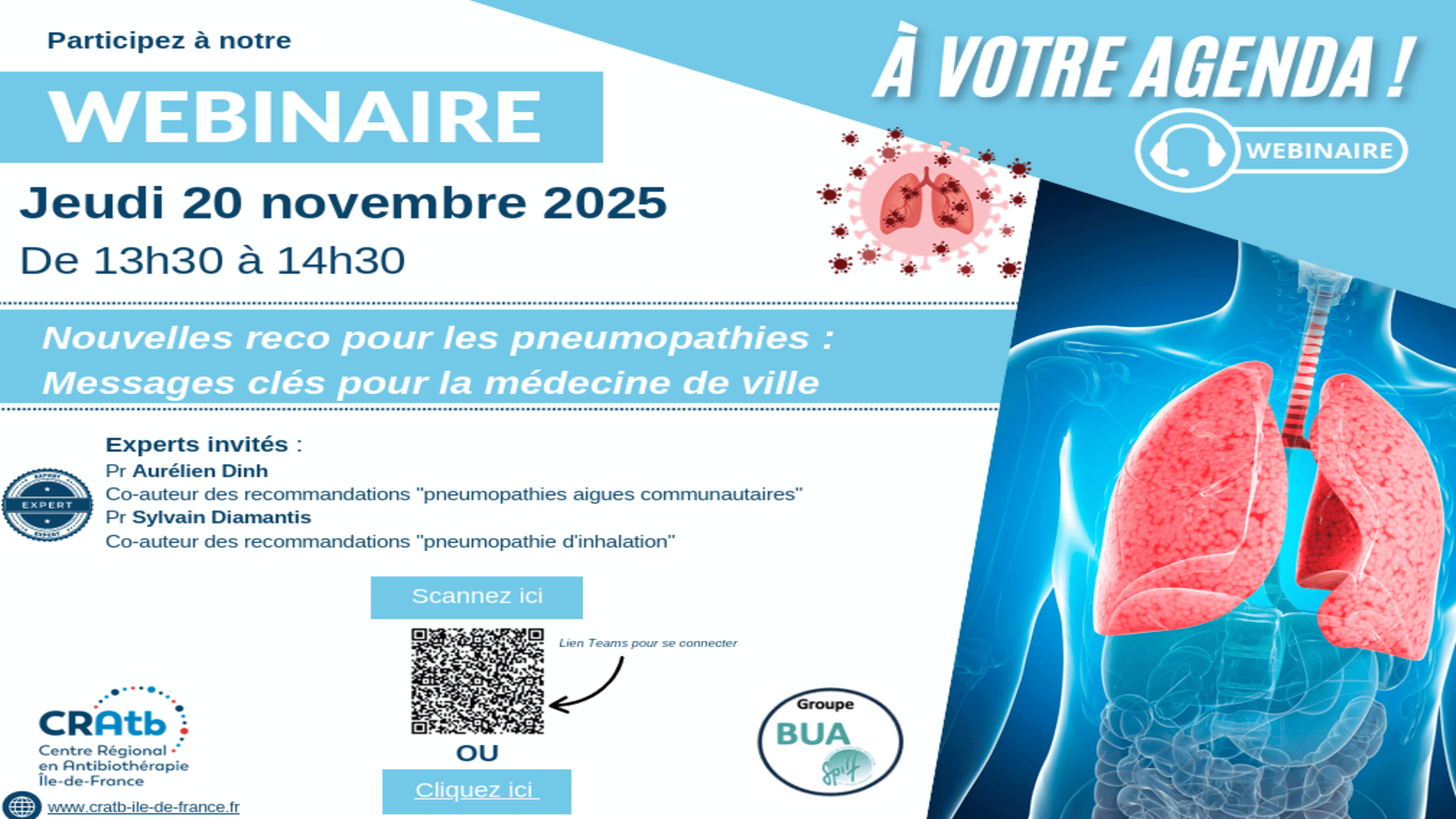 Le CRAtb Île-de-France et le Groupe BUA de la SPILF vous invitent à un webinaire dédié aux nouvelles recommandations sur les pneumopathies, avec un focus sur les messages clés pour la médecine de ville.
